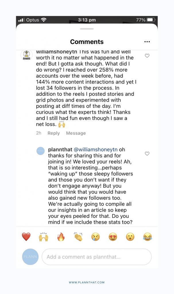Yep, there’s also the possibility you may lose some followers along the way, when you start posting more Reels. At Plann, our following count when slightly down throughout the challenge, before jumping back up. Beekeepers Williams Honey also lost 34 followers throughout the 9 days.