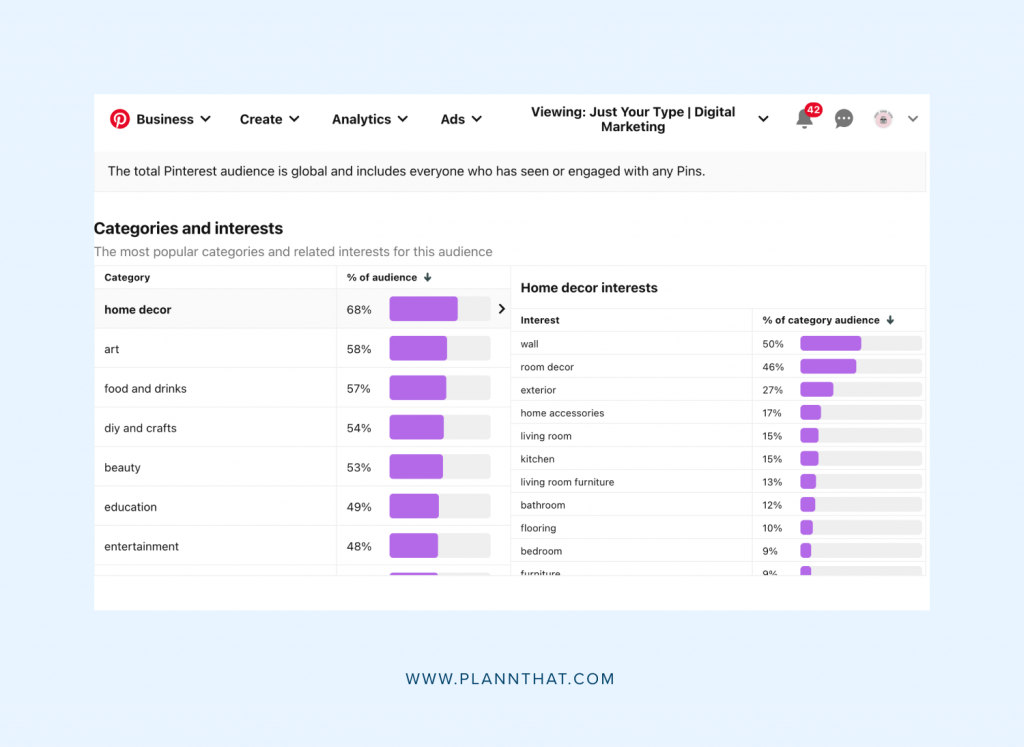 Select “Audience Insights,” choose “All Pinterest Users,” and scroll down to see which categories are generating most interest. Click on each individual category to view popular subcategories and searches!