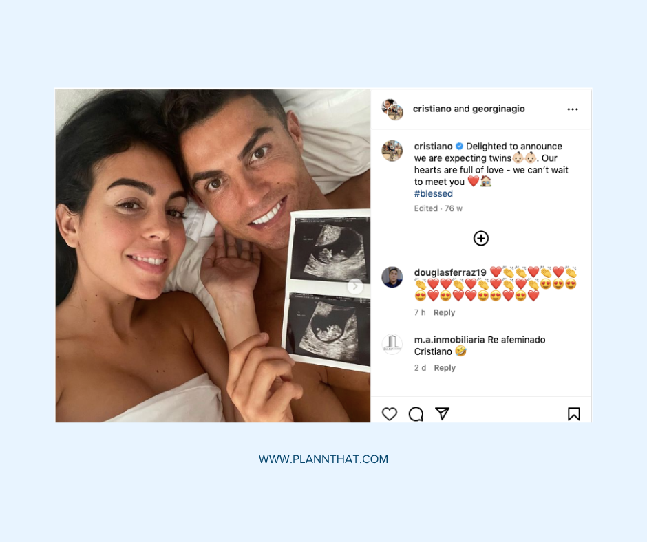 At number 9, Cristiano Ronaldo and his wife, Georgina, make an important announcement. In 2021, the couple shared the news that they were expecting twins. Sadly, one of the twins passed away during birth. The Instagram post is now home to an outpouring of support for the grieving parents.